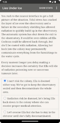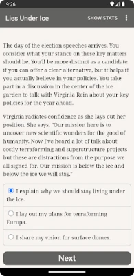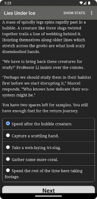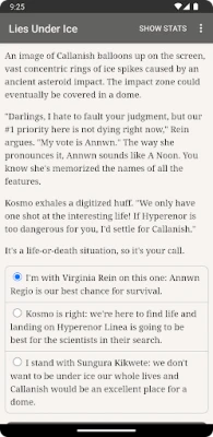 “Lies Under Ice” is a 200,000-word interactive science fiction novel by Joey Jones, where your choices control the story. It's entirely text-based—without graphics or sound effects—and fueled by the vast, unstoppable power of your imagination.