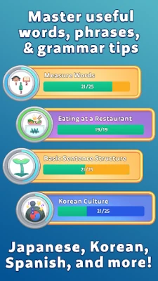 - Learn words and phrases relevant to everyday life with themes like Ordering Food and Meeting New People.